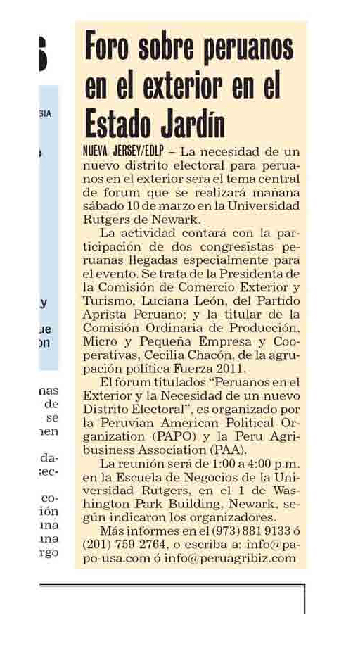 El forum titulado “Peruanos en el Exterior y la Necesidad de un nuevo Distrito Electoral”, fue organizado por la Peruvian American Political Organization (PAPO) en conjunto con la Perú  Agribusiness Association (PAA).