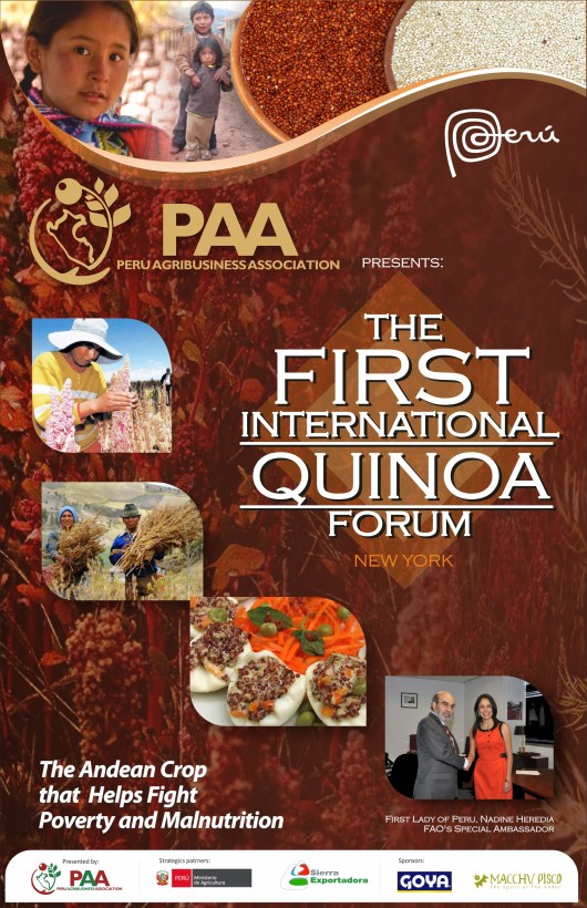 El fórum es organizado Peru Agribusiness Association Inc. conjuntamente con el Ministerio de Agricultura del Perú (Minag), Sierra Exportadora y la empresa Goya Foods, dentro del marco del lanzamiento del Año Internacional de la Quinua que se celebrará en el 2013 y que promueve la Primera Dama del Perú, Nadine Heredia, al haber sido elegida Embajadora Social de la FAO (Organización de Alimentos y Agricultura de las Naciones Unidas)