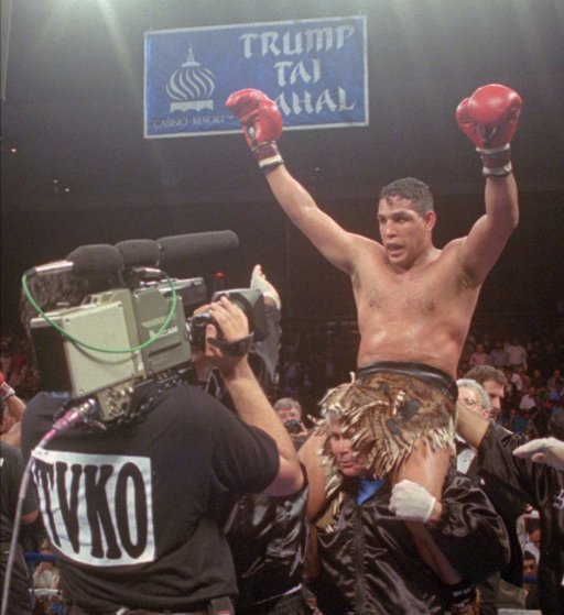 En esta foto del 22 de junio de 1996, Héctor «Macho» Camacho es alzado en hombros luego de vencer por decisión unánime al panameño Roberto Durán, en Atlantic City, Nueva Jersey.
