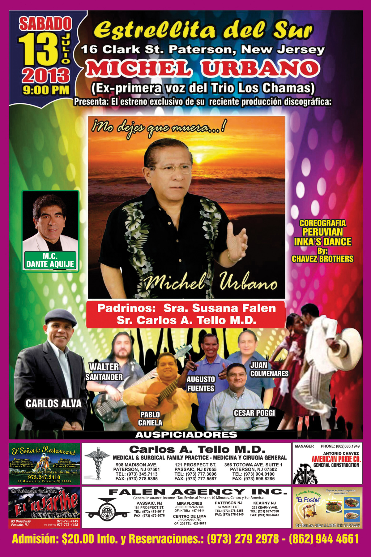 Michel Urbano, quien fuese la última primera voz del emblemático «Trío Los Chamas» y del renombrado «Trio América» , presentará HOY 13 de julio en el Restaurante «ESTRELLITA DEL SUR», [16 Clark St. Paterson, New Jersey] su más reciente producción musical: » NO DEJES QUE MUERA».