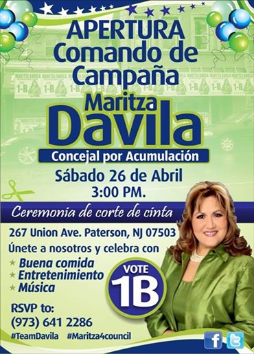 PATERSON, 26 DE ABRIL – Maritza Dávila, candidata a Concejal por Acumulación (At Large) de la ciudad de Paterson inauguró hoy su cuartel general de campaña, en el 267 de Union Avenue, con el importante respaldo de concejales peruanos de diferentes ciudades de Nueva Jersey, incluyendo a Jesús Huaranga y Víctor Villalta de Harrison; y Richard Esquiche de Prospect Park.