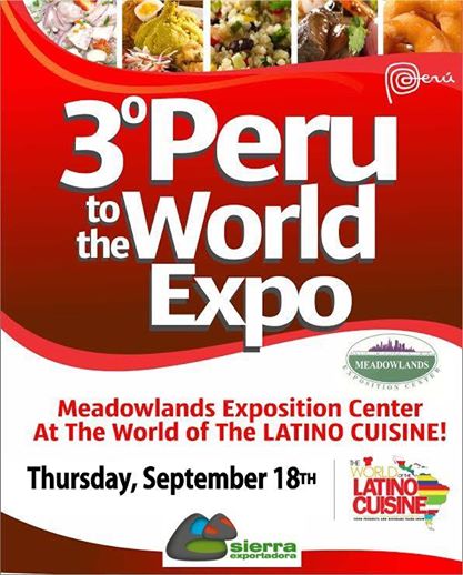 Perú Agribusiness Association lanzará su tercera feria gastronómica con el propósito de difundir la cultura del Perú alrededor de su variada y riquísima cocina. Chefs, restaurantes, folklore, pisco y otros productos peruanos de exportación serán presentados durante la Feria Peru to the World Expo, que se llevará a cabo en el Meadowlands Expo Center (355 Plaza Drive, Secaucus, NJ 07094) de Secaucus, Nueva Jersey, el jueves 18 de septiembre, entre 10 a.m. y 9 p.m. Para mayores informes, llamar al (201) 759 2764 o visite la página web: www.perutotheworldexpo.com