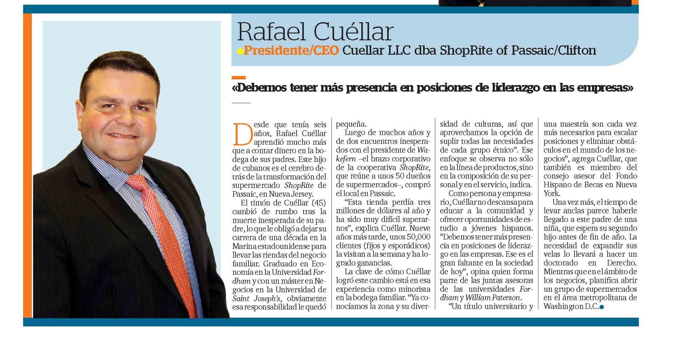 Trabajador desde los seis años de edad, junto a sus padres, Rafael Cuéllar ha sabido aprovechar toda la experiencia de estar pegado al negocio familiar. Hoy en día, a los 45, es propietario de un supermercado Shop Rite en la ciudad de Passaic, Nueva Jersey, con 300 empleados y unos 50,000 clientes semanales. La cadena estadounidense Shop Rite, que cuenta con 70 años de trayectoria, tiene en Rafael Cuéllar no sólo al único latino propietario de una franquicia, sino a un guía y asesor permanente de cómo servir a esta comunidad tan diversa. Rafael dirige desde hace una década el Shop Rite ubicado en el 503 de la avenida Paulison, en Passaic, Nueva Jersey, luego de tomar las riendas del supermercado President, que fundara su recordado padre, el cubano Evelio Cuellar, uno de los comerciantes pioneros del Estado Jardin. Ante el repentino fallecimiento de Evelio padre, Rafael tuvo que abandonar una prometedora carrera militar en la Marina de los Estados Unidos que había iniciado 10 años antes. Fue durante su paso por la Marina que pudo estudiar una carrera universitaria y graduarse en Economía de la Fordham University para luego lograr una Maestría en Negocios (MBA) en la St. Joseph’s University.