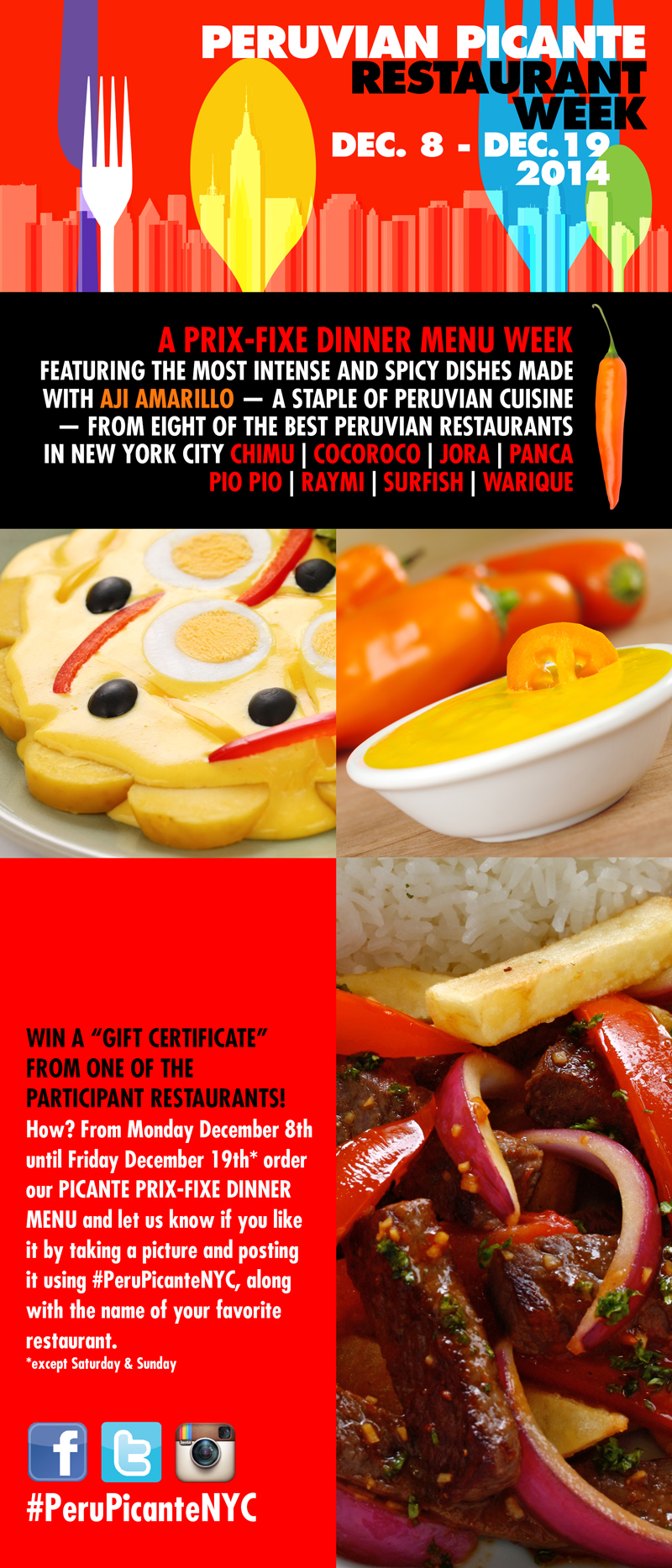 Falco explicó que en esta oportunidad hay ocho restaurantes participantes: Chimu, Cocoroco, Jora, Panca, Pio Pio, Raymi, Surfish y Warique. Alli, los neoyorquinos podrán deleitarse con los distintos platos de la gastronomía peruana que llevan como «secreto del sabor» al Ají Amarillo.