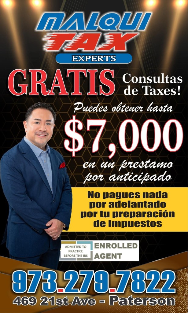 PATERSON, ENE 31 – La empresa especializada en impuestos «MALQUI TAX» está cumpliendo su 50 aniversario de fundación y ofrece, por ese motivo, CONSULTAS GRATUITAS a sus clientes y amigos, según nos comunica su presidente Ceasar Malqui, orgullo de nuestra comunidad.
