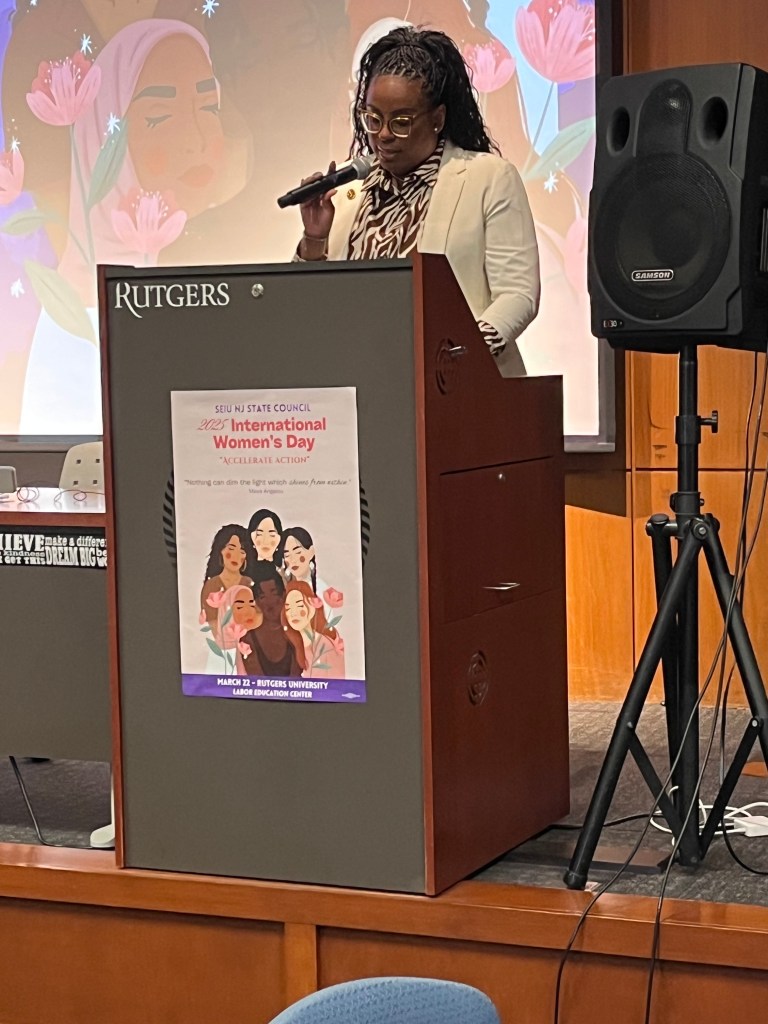 «Acelerar la Acción» fue el tema del día, que comenzó con un mensaje de bienvenida de la presidenta del Consejo Estatal de SEIU NJ, Megan Chambers, seguido por la Congresista LaMonica McIver del Distrito Congresional 10, quien habló sobre las numerosas contribuciones de las mujeres a la sociedad y al mundo.