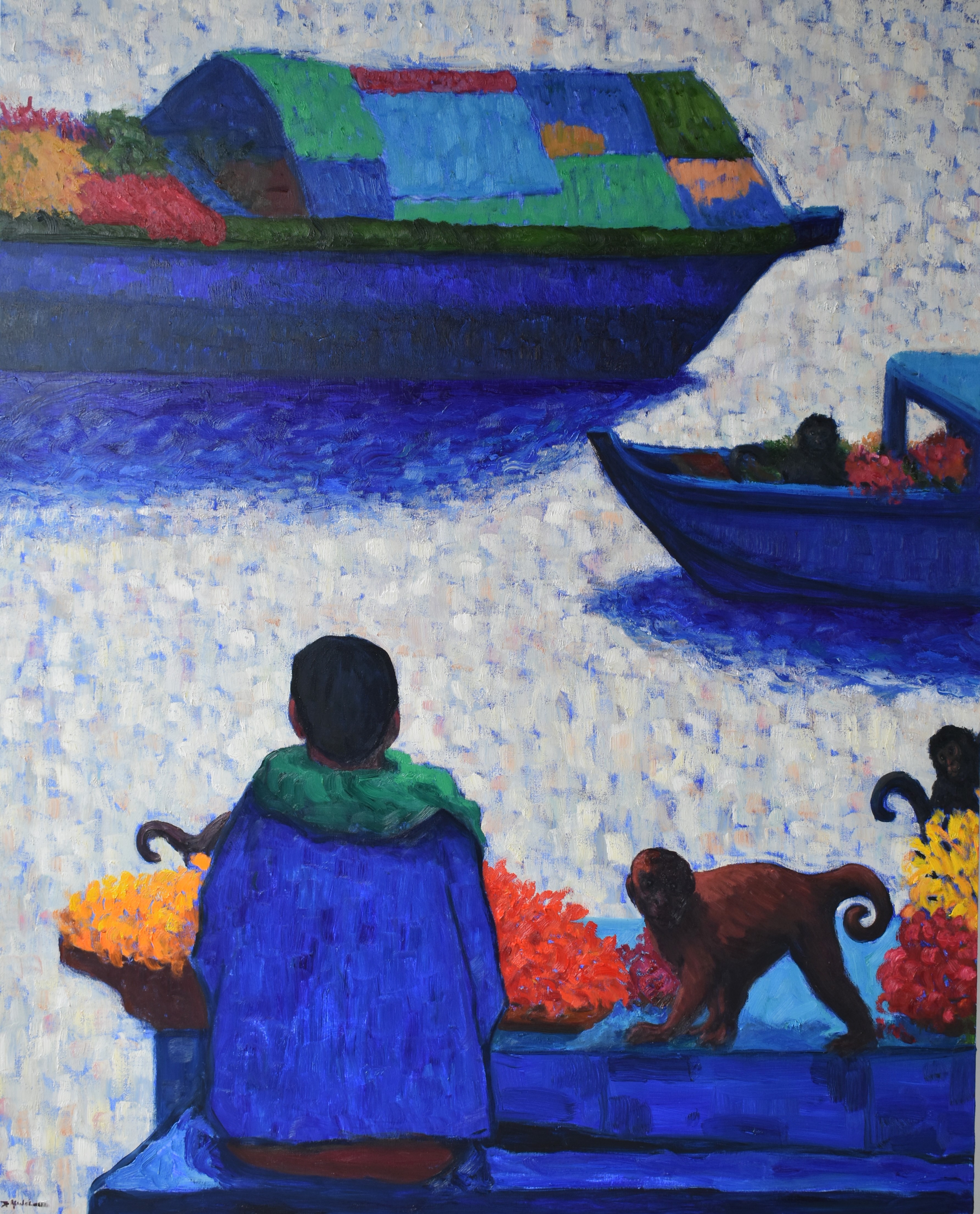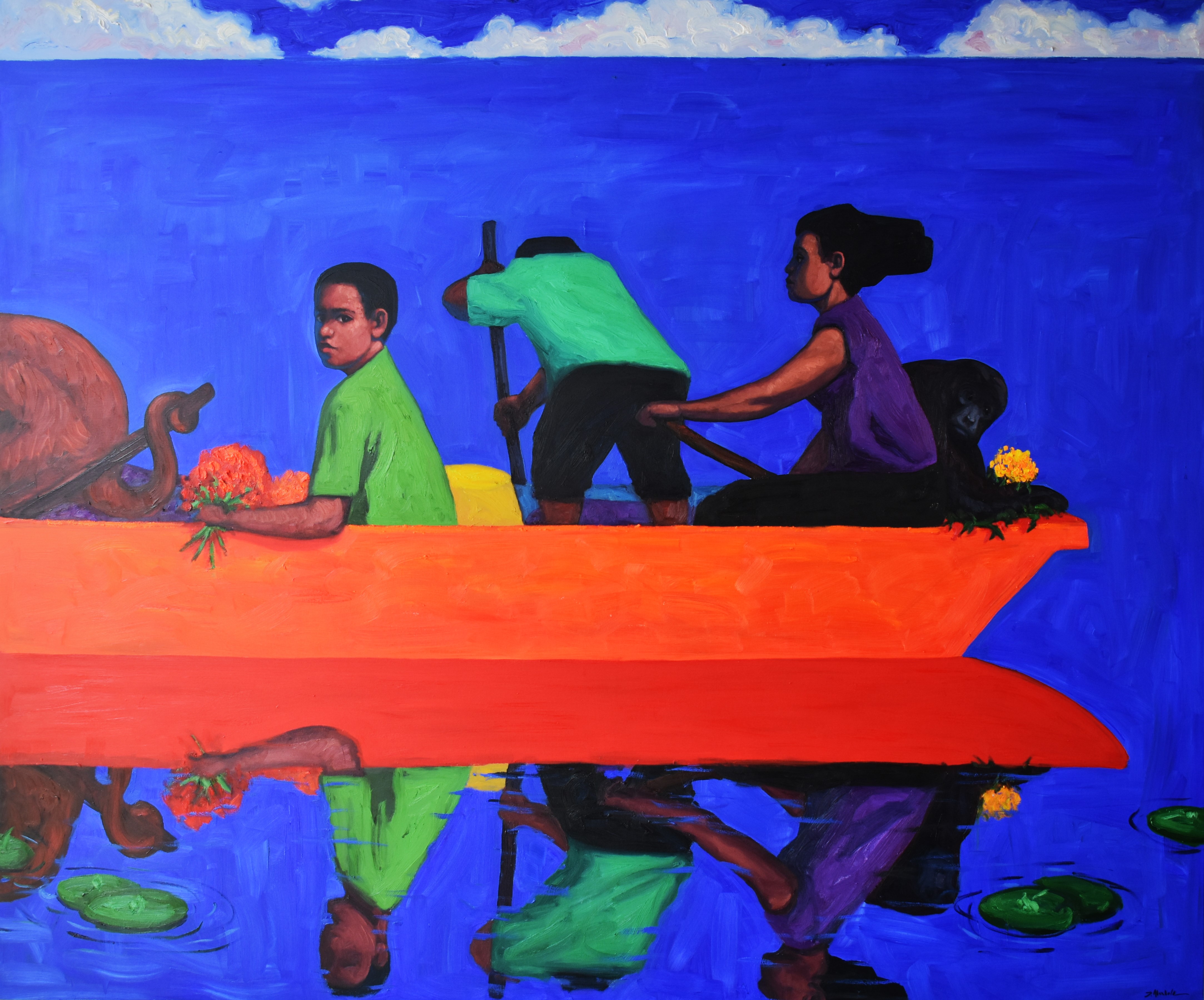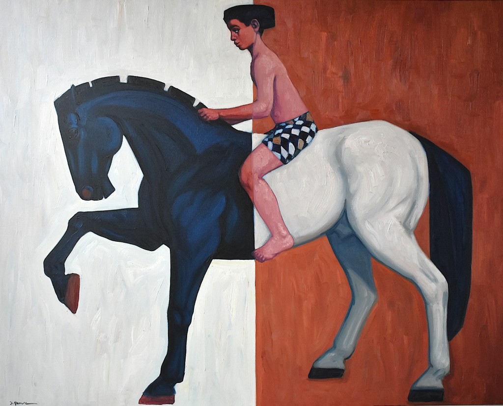 -Estoy desarrollando una temática fluvial. Barcas y balsas que cruzan cuerpos de agua, guiadas por niños o personajes simbólicos, cargadas de flora, fauna y luz. También he trabajado una pequeña serie de caballos y niños, inspirada en la cultura etrusca. Me interesa cómo ciertas imágenes arcaicas pueden seguir teniendo vigencia emocional y estética.