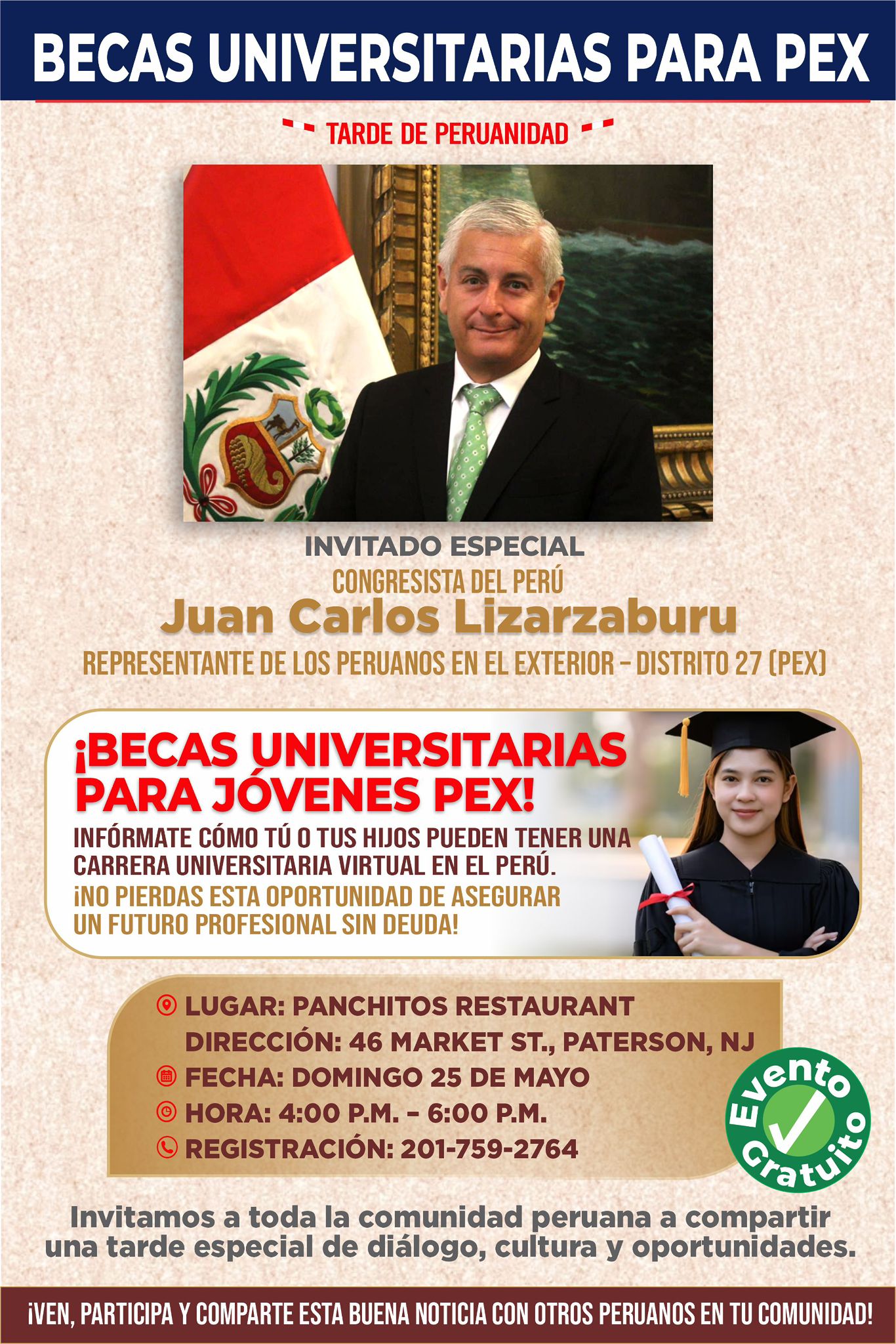 PATERSON, MAY 23 – La comunidad peruana en Nueva Jersey tendrá la oportunidad de participar este domingo 25 en una “Tarde de Peruanidad”, un evento especial de encuentro, cultura, diálogo y oportunidades, que contará con la destacada participación del Congresista de la República del Perú, Juan Carlos Lizarzaburu, representante de los Peruanos en el Exterior – Distrito 27 (PEX).