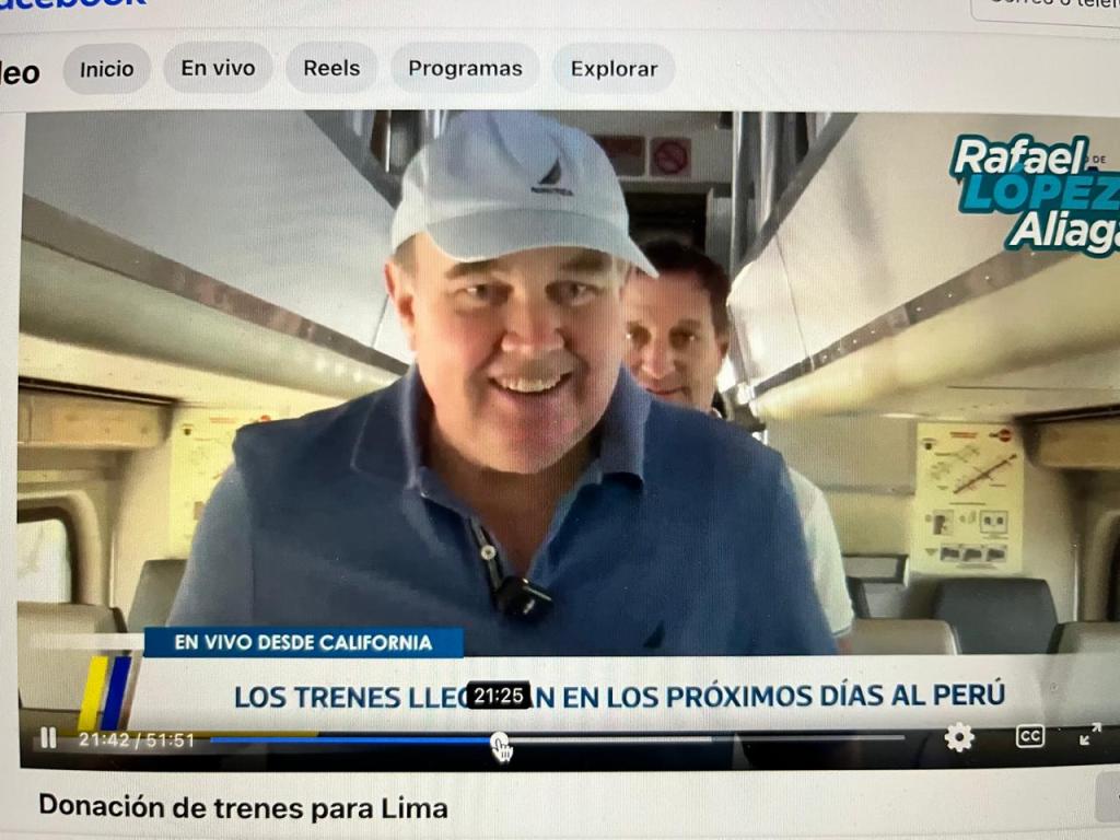 LIMA, JUN 14 – Rafael López Aliaga, alcalde de Lima, informó que el próximo miércoles 18 de junio estará presente en el puerto de Stockton, California, en la partida del barco que traerá parte del lote de trenes donados por el Gobierno Norteamericano a la Municipalidad Metropolitana de Lima (MML). Tiene previsto reunirse con el Gobernador de California el demócrata Gavin Newson y con Nancy Pelosi, presidenta de Caltrain.