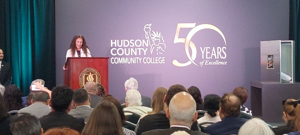 El programa formal, que tuvo lugar en el primer piso de la Biblioteca Gabert, contó con las palabras del presidente, Dr. Christopher Reber, y las reflexiones de destacados estudiantes, exalumnos, docentes y miembros de la dirección del Colegio y del Condado, entre ellos la administradora y exalumna del HCCC, Silvia Rodríguez (la tercera estudiante que se matriculó en el Colegio), el veterano profesor de Artes Escénicas, Joseph Gallo, las actuales estudiantes Anu Bisht y Neivi Núñez y la presidente del Consejo Directivo del HCCC, Jeanette Peña. También se presentó un video especial con un mensaje del senador Cory Booker. El presidente emérito del HCCC, Dr. Glen Gabert, el administrador emérito del HCCC, William J. Netchert, y el ex ejecutivo del Condado de Hudson, Tom DeGise, fueron homenajeados con la primera entrega de los premios Heart of Hudson de la Fundación del HCCC, en reconocimiento a sus importantes contribuciones al crecimiento del HCCC a lo largo de los años.