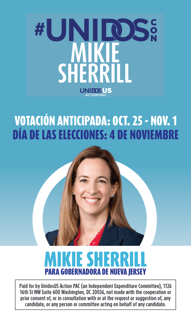 “En UnidosUS Action PAC, apoyamos a líderes que comparten nuestros valores y nuestra visión de un Estados Unidos donde cada latino tenga la oportunidad de prosperar. Mikie Sherrill es una de esas líderes. Como veterana de la Marina, madre y una destacada funcionaria pública, ha luchado para ampliar el acceso a una atención médica asequible, proteger la libertad reproductiva y crear empleos bien remunerados que impulsen a las familias trabajadoras”, dijo Janet Murguía, presidenta de UNIDOSUS ACTION PAC. “Ella comprende que el futuro de Nueva Jersey depende de invertir en toda su gente, incluyendo a las familias latinas trabajadoras que fortalecen este estado cada día. Nos enorgullece apoyarla y confiamos en que, como próxima gobernadora de Nueva Jersey, Mikie Sherrill hará de nuestra comunidad no una idea secundaria, sino un pilar fundamental de su administración”.
