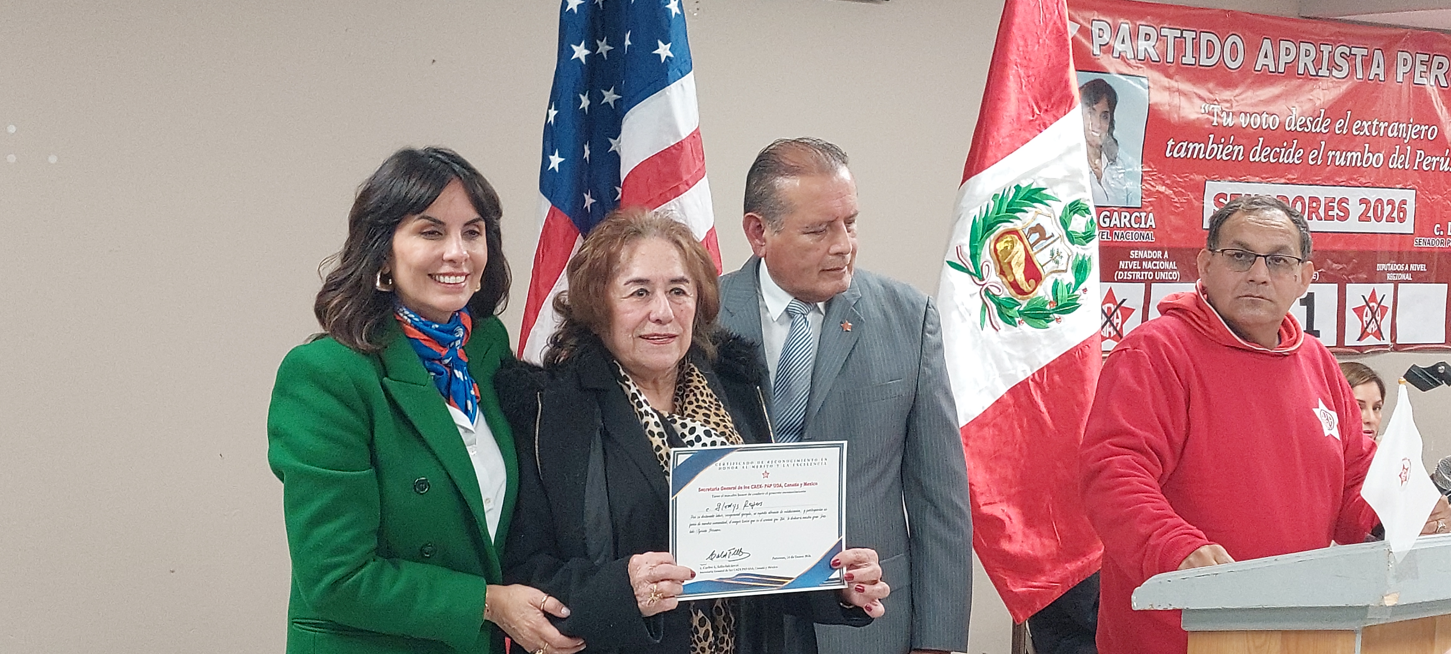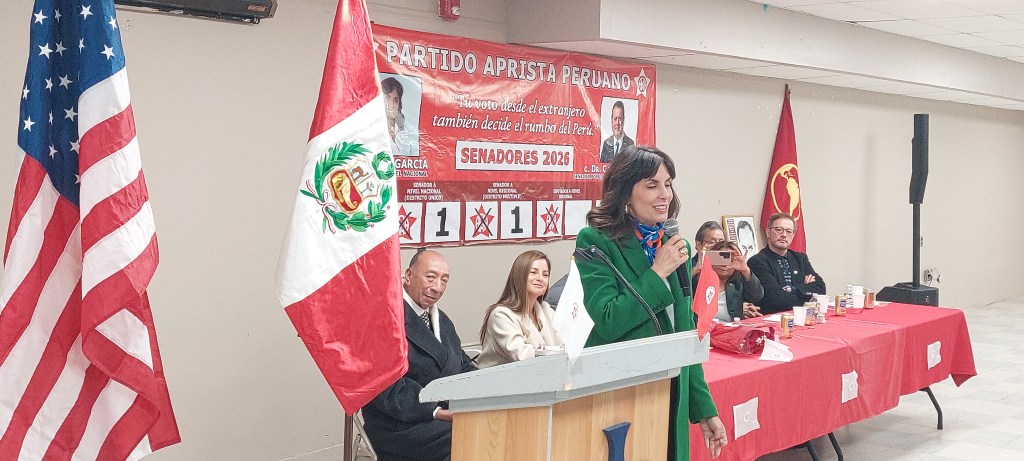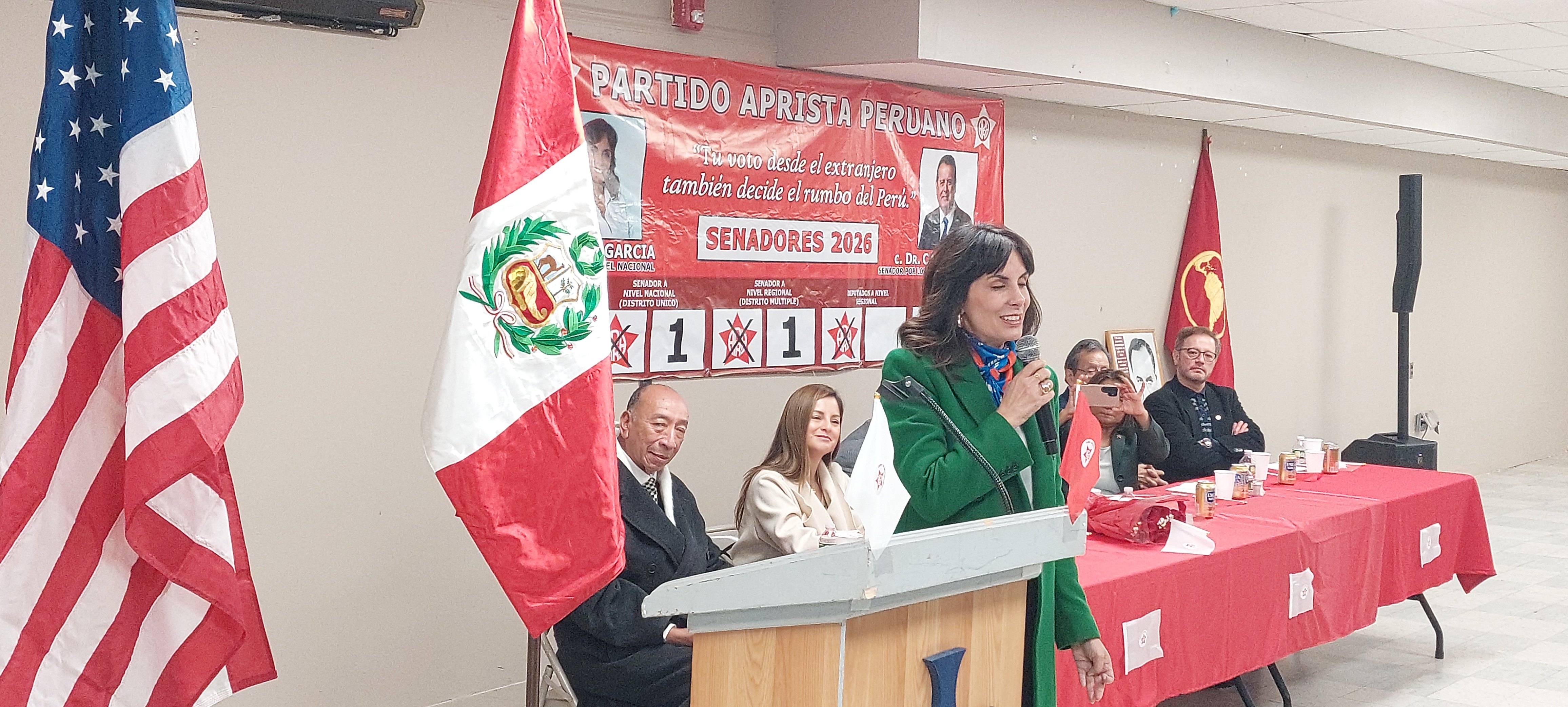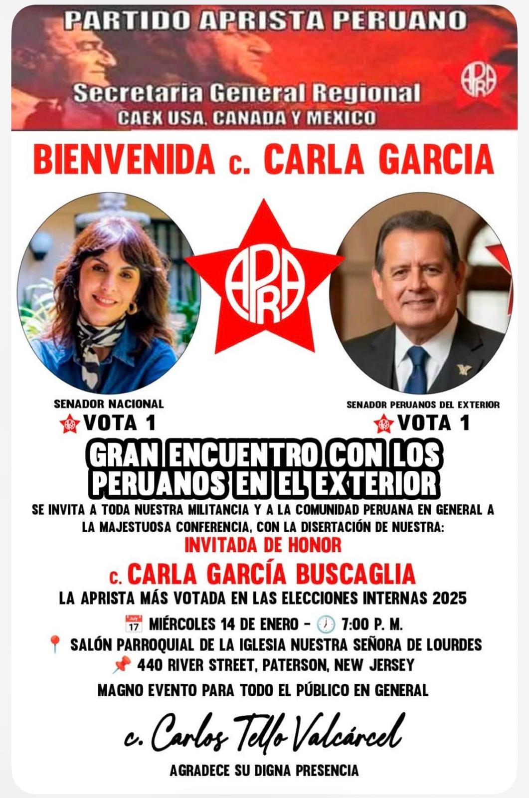 Hija del expresidente Alan García y actual candidata al Senado de la República, participó este 14 de enero 2026 en una reunión con la comunidad peruana en general, invitada por el Secretario General Regional del Partido Aprista Peruano en EEUU, Canadá y México, Dr. Carlos Tello.