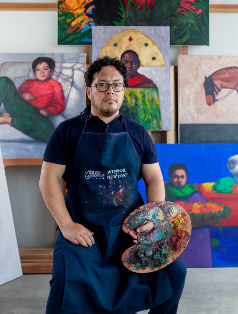 -Sí, claro. Con los viajes que hago a la selva, a la costa. La primera vez que tuve contacto fue también en México. Justo en la época en que me encontrara estudiando, hubo muchos migrantes somalies, y yo vi un niño somalí que fue el primer cuadro que realicé de los migrantes, fue mi primera obra donde yo representé un migrante y donde empecé a involucrarme más. Empecé también a viajar mucho a Chincha aquí en Perú, ya que ahí hubo mucha migración también. Viviendo con ellos, haciendo estudios sobre África, sobre los primeros hombres, las primeras migraciones, cómo, de África fueron a todas partes del mundo. Así, haciendo los estudios, viajando, tomando fotos, imágenes, bocetos, retratando, conviviendo, conversando, escuchando su filosofía, sus pensamientos, y así ya en el taller pude unir todas esas ideas y esas imágenes, y así componerlas y plasmarlas luego.