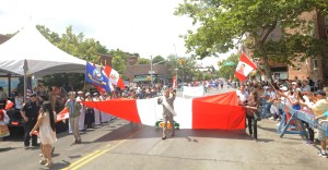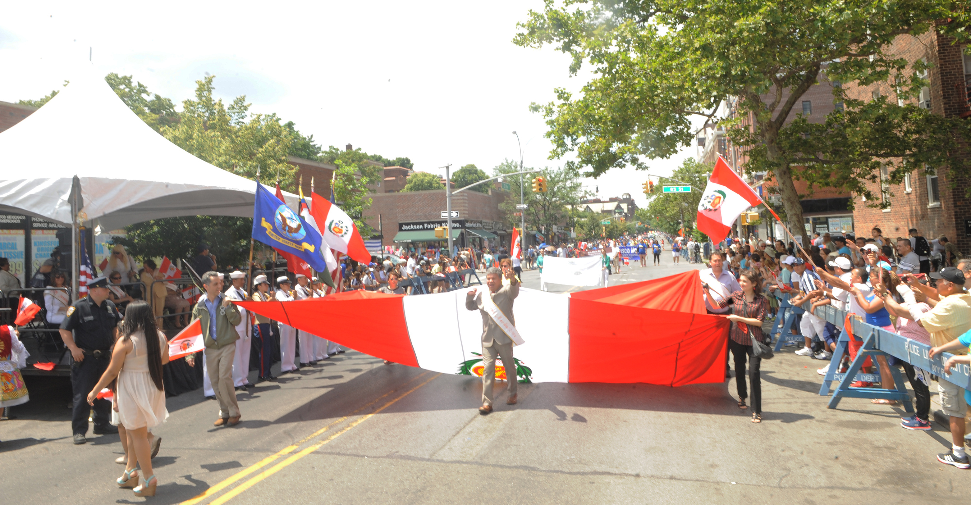 Una gigantesca bandera peruana fue paseada por la avenida 37 de Jackson Heights, Queens, Nueva York en la histórica marcha. FOTO: EDILBERTO ALVARADO